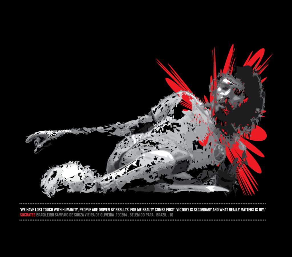 Sócrates Brasileiro Sampaio de Souza Vieira de Oliveira, born 19 February 1954 in Belém do Pará, Brazil. one of the great midfielders and most compelling characters in modern football history, Sócrates captained the Joga Bonita Brazil squad in the 1982 and 1986 World Cups. In the same period he graduated from the Faculdade de Medicina de Ribeirão Preto, receiving a doctorate in medicine; and later a doctorate degree in philosophy. Revered in his homeland he is notorious for his love for life, along with a passion for both cigarettes and alcohol!